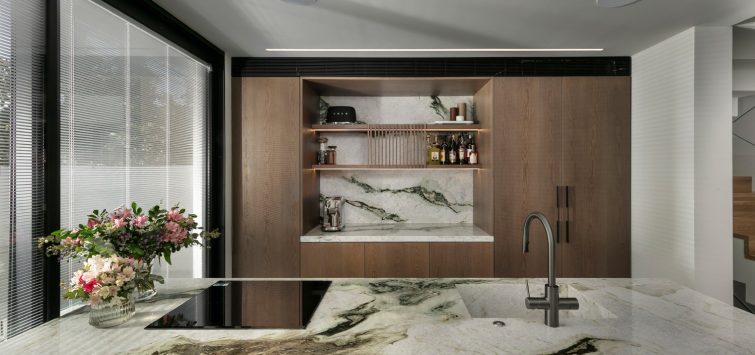 התוצאה מרהיבה, ייחודית ומשלבת חומרים טבעיים שנותנים חיים לבית. הן בריצוף השיש האפור בעל הגוון המשתנה, והן במשטח השיש המיוחד במטבח שגונב את ההצגה.