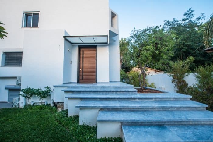 אושן בלו מבית שיש דן בעיבוד מותז ומכובס המותאם למדרגות וריצוף הכניסה לבית. עיצוב: בועז שניר